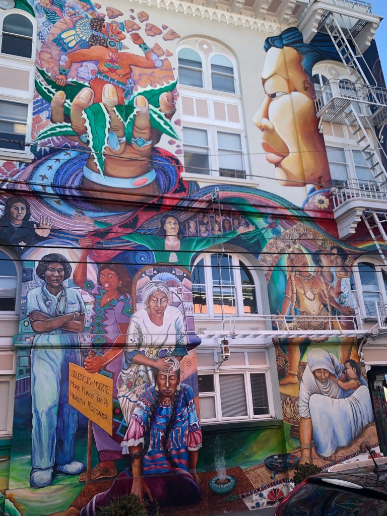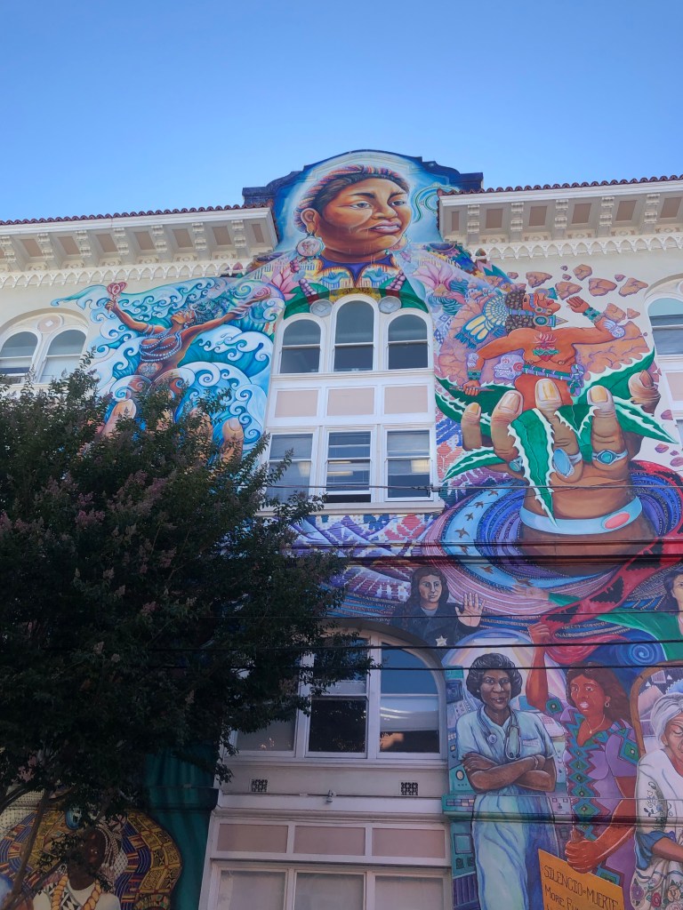 Lasciamo il Cuore del Quartiere Finanziario per raggiungere Il Mission District,dove il cuore si trova davvero.Il nome deriva dalla presenza di una delle tante chiese sparse nella California,la Mission de San Francisco de Asis meglio conosciuta come Mission Dolores.La cappella e’ l’edificio piu’ antico della citta’ (1776) ampliato poi da una Bellissima Basilica al suo fianco (1918).Questa missione offriva Cibo e Protezione ai Nativi,in quanto contribuirono alla costruzione della Cappella e in parte si convertirono alla religione Cattolica.Al fianco della Cappella c’e anche un piccolo Cimitero e dei Fiori per Ricordare i defunti Missionari e anche ai Nativi.Entriamo nella Basilica dove rimango sbalordito dalla sua Grandezza e Combinazioni di Colori derivanti dalle varie Raffigurazioni interne.Sono in pace seduto su una Panchina ad osservare la basilica,un momento dove poter stare con se stessi a Riflettere.Nella Cappella originale e’ stato girato una Parte di “Vertigo – La donna che visse due volte” di Alfred Hitchcock nel 1957.Uscendo dalla Mission,giriamo nel quartiere Osservando quanto sia Diverso dagli altri,un mix Latino e Alternativo con Alcuni Interessanti Murales.